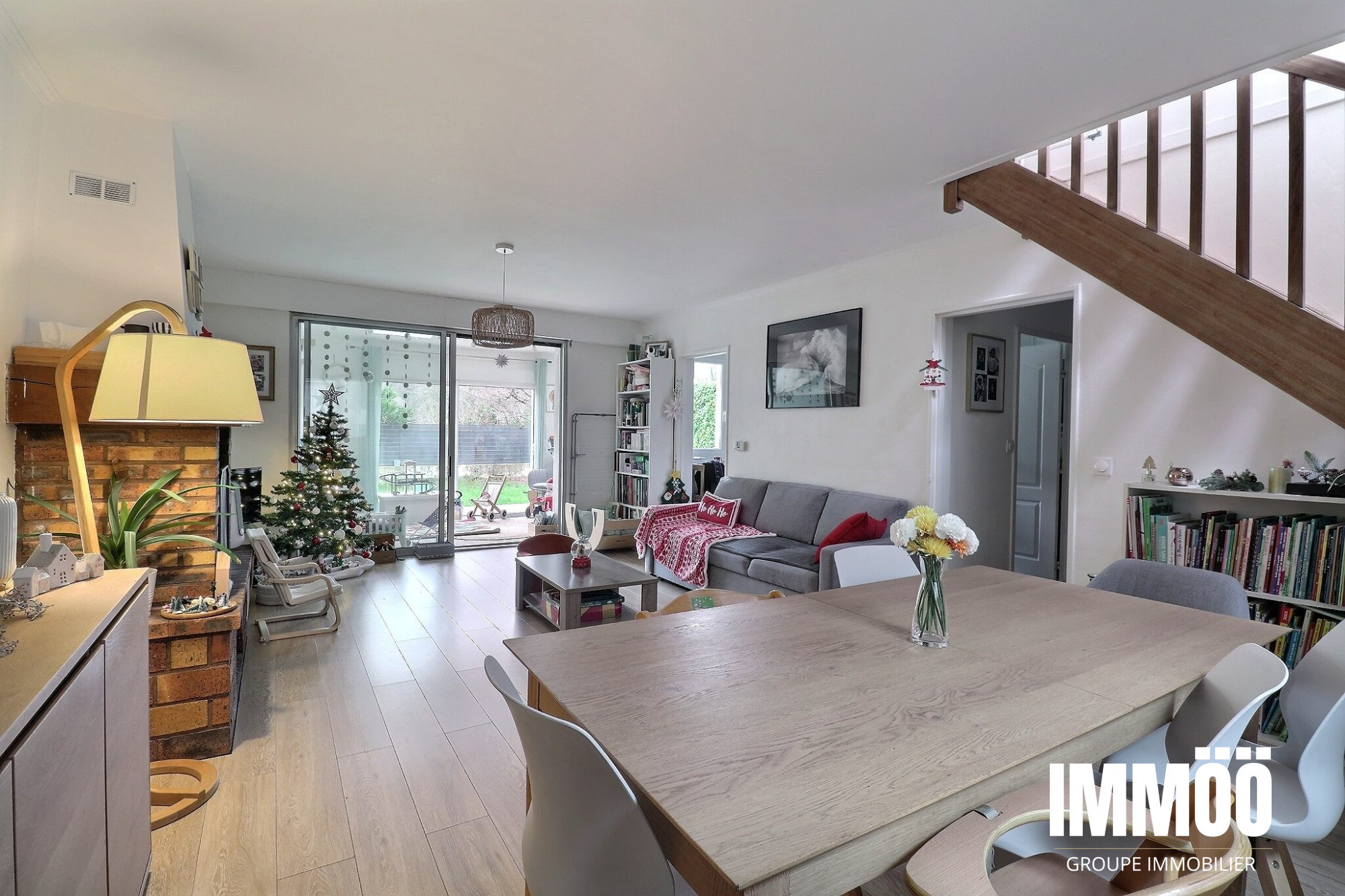 Le spacieux séjour, agrémenté d’une cheminée, crée une ambiance chaleureuse et conviviale. Depuis le salon, vous accédez directement à une véranda et à une terrasse, parfaites pour profiter des beaux jours.
